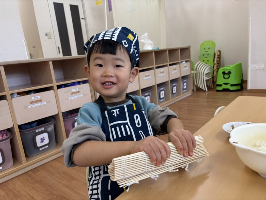 巻き簀を使って、「美味しくなーれ!」と力強く巻いています!