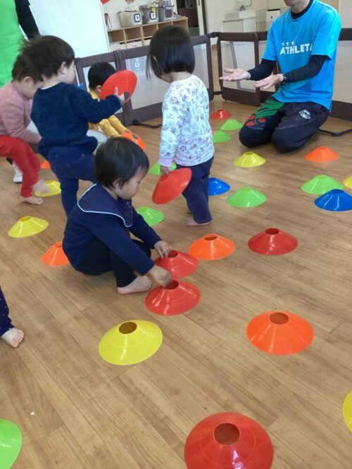 このなかから先生が言う色のカップだけを取りに行って集めますよ