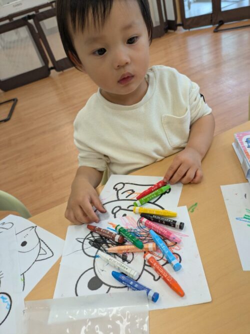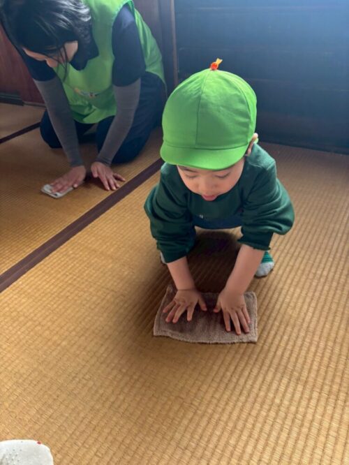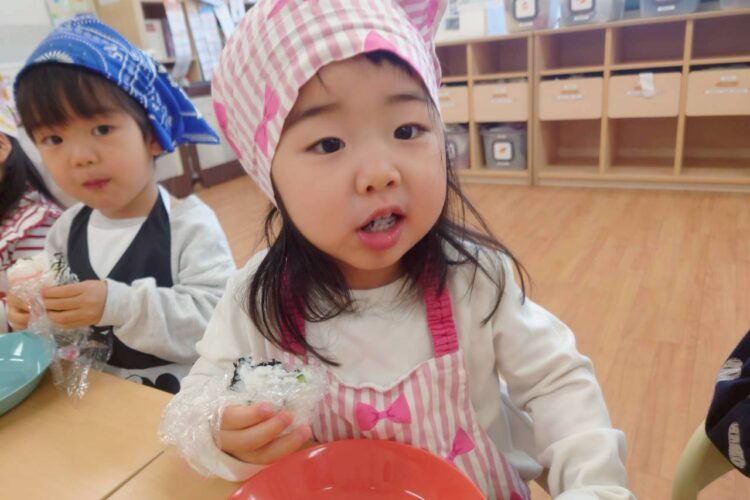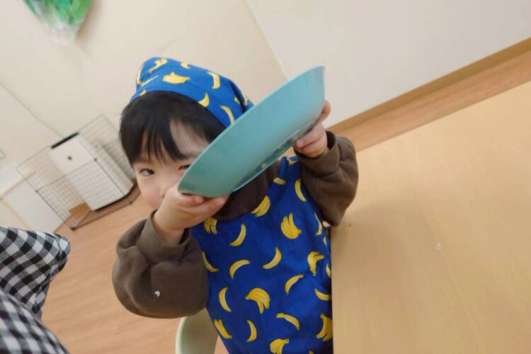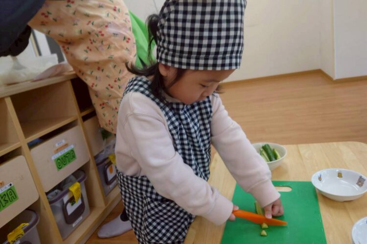 赤ちゃんぬいぐるみに、お野菜を食べさせてあげたり