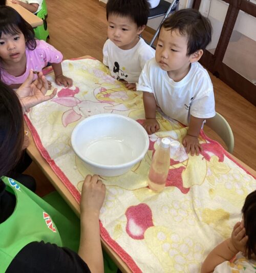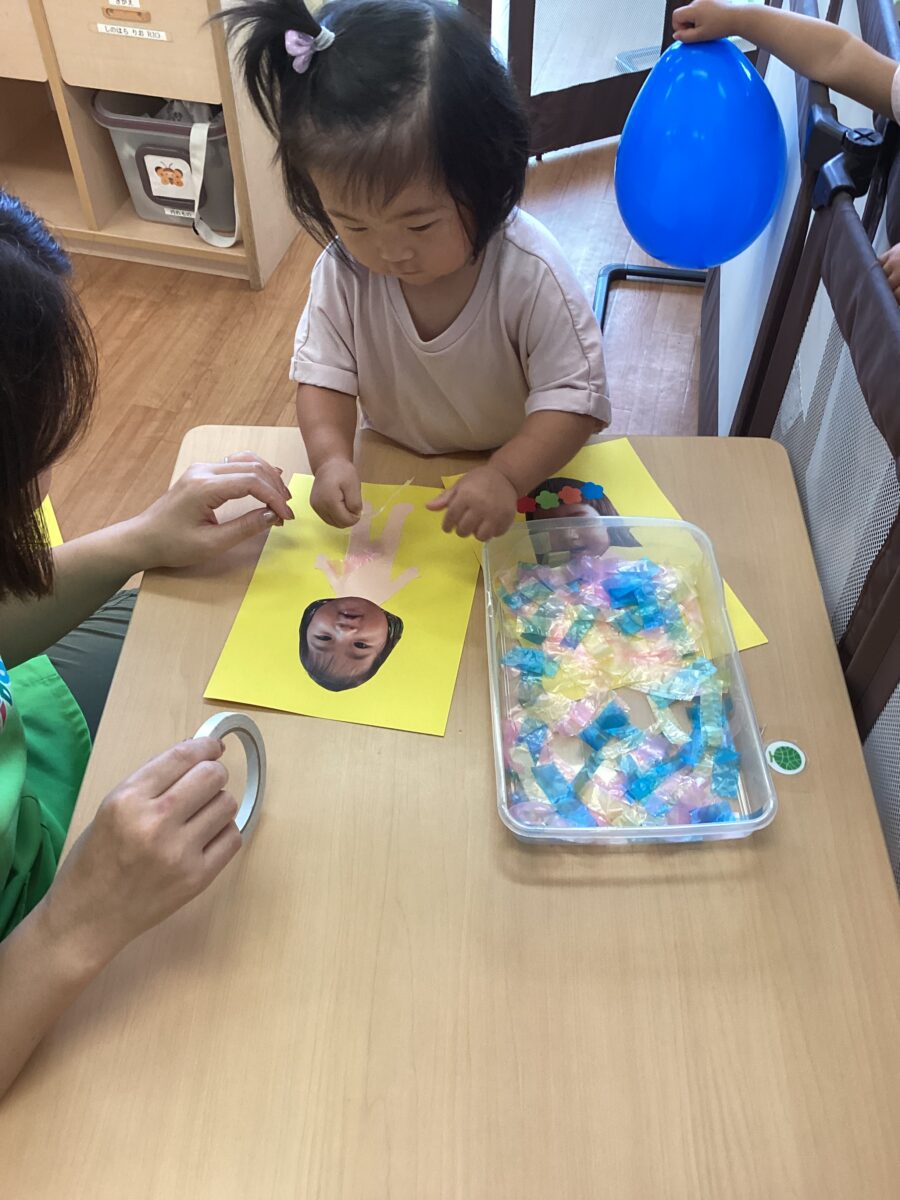 弾き絵をしたのですが、氷を使って色をつけたりと、夏らしい制作に子どもたちは大喜び!