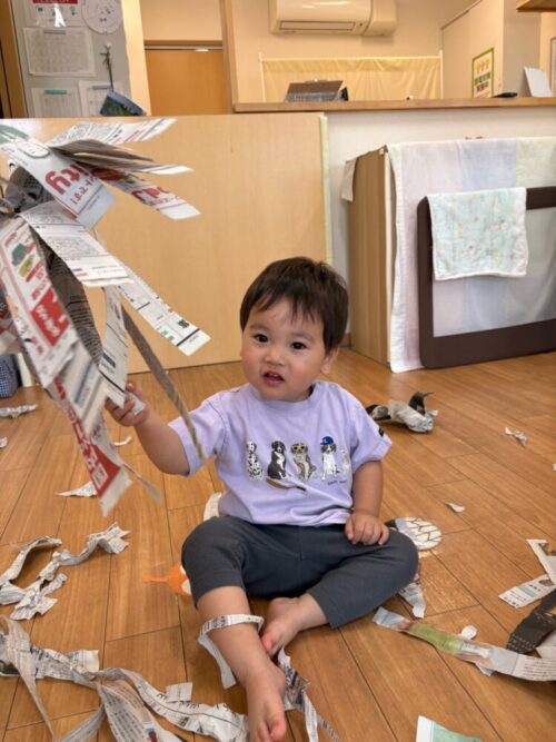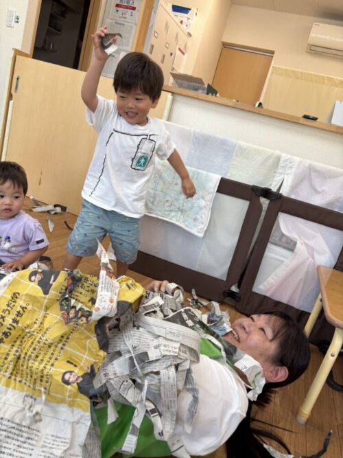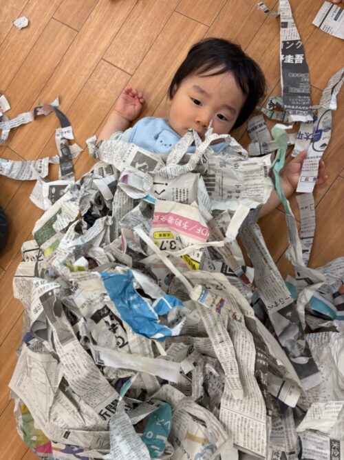 たくさんの新聞紙を破ったり投げたりして楽しみました😊