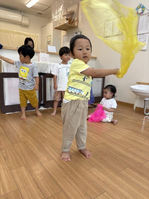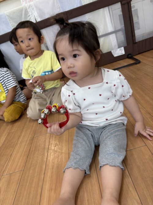 歌に合わせて鈴を鳴らしたりマラカスを振ったりして楽しそうでした♪