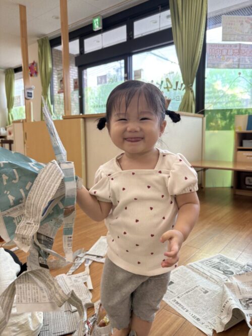 さて、今日はお部屋で新聞紙遊びをしましたよ!
