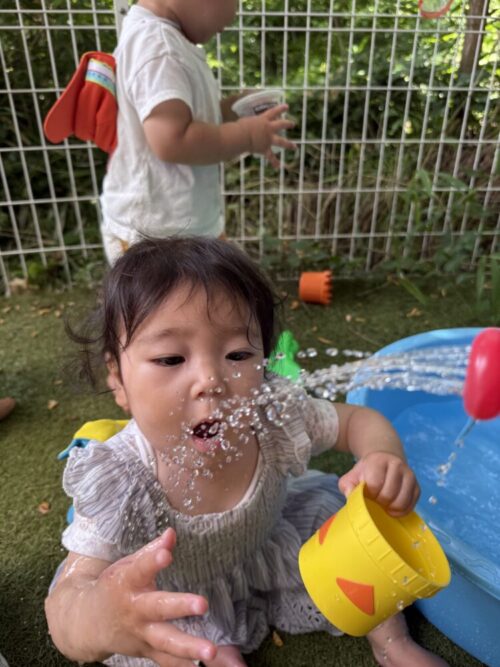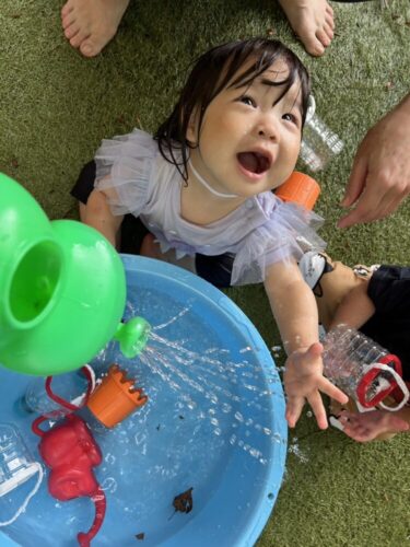 ひよこ組のお友だちも水がかかってもへっちゃらで、水の流れを一生懸命目追う姿がありました👀