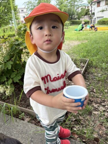 ダンゴムシを捕まえてカップにテラスで見つけたダンゴムシを入れて観察する子👀✨