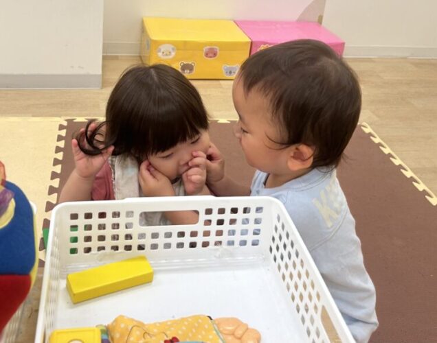 1歳児のお兄さんと遊ぶ0歳児さん🩷 「かわいいね☺️」と伝えている姿に異年齢での関わりならではのやりとりに素敵だなと思います💭