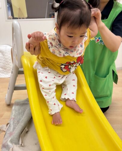 すべり台、シュー!!!!楽しくて何度もすべる子どもたち♡0歳さんのお友だちは保育者に支えてもらいながらすべります🛝
