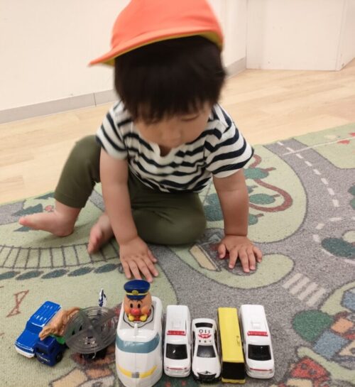 水遊びの順番待ちで、帽子をかぶって準備はバッチリ👍車を並べて遊んでいました🌈