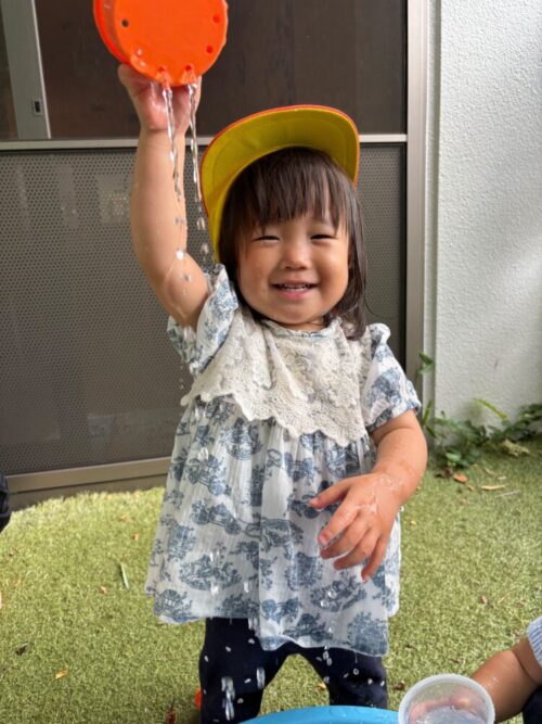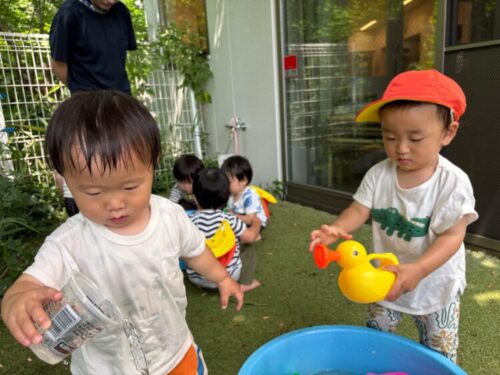 お外では水遊びをして、楽しむ姿がありましたよ🌱お友だちや保育者と一緒に「じゃー!」と水を流して遊ぶ可愛いあひる組でした🦆