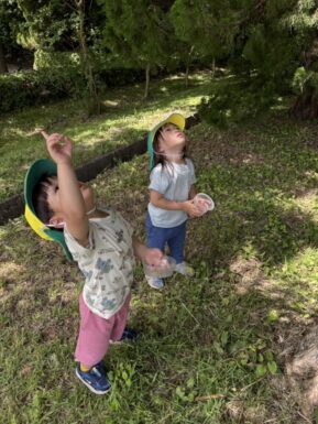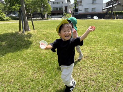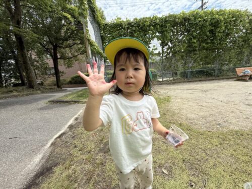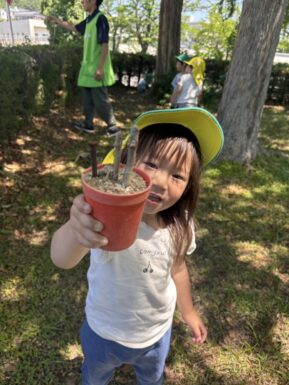 「いたー❗️」ダンゴムシをカップに入れてとびきりの笑顔で先生たちに見せてくれました✨