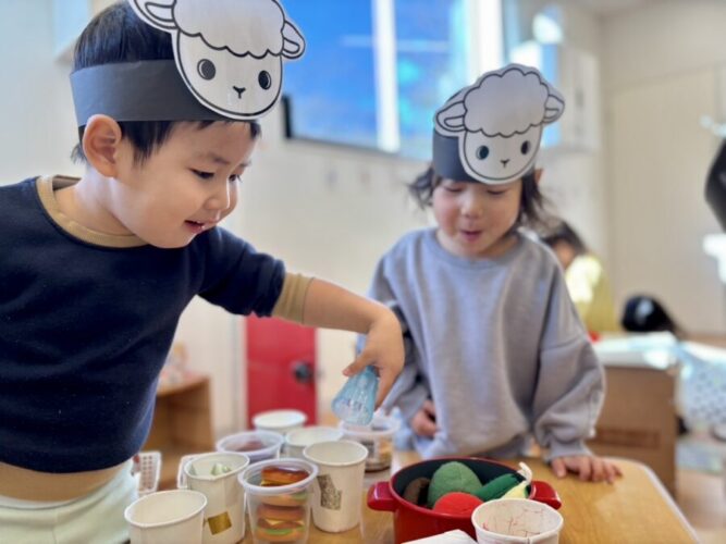保育者が設置したドアを使ったり、お面をつけて動物になりきって遊びを展開する子どもたちです🐺🐐