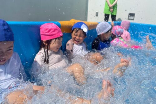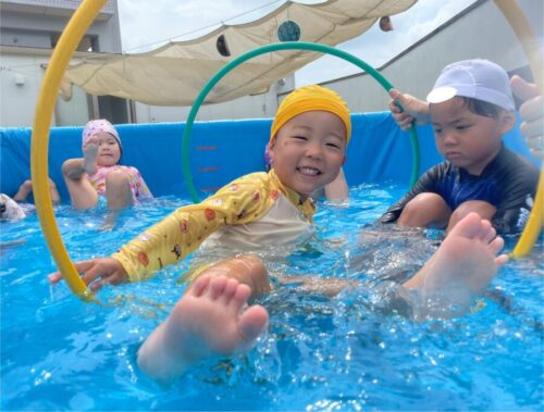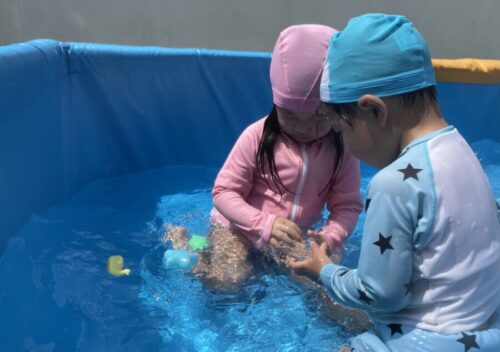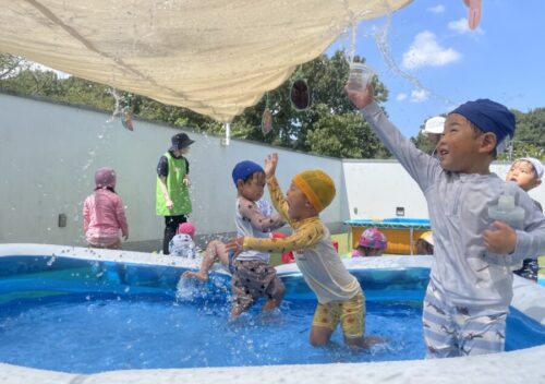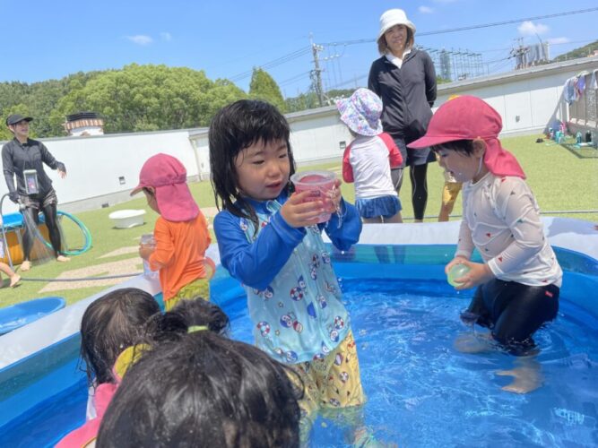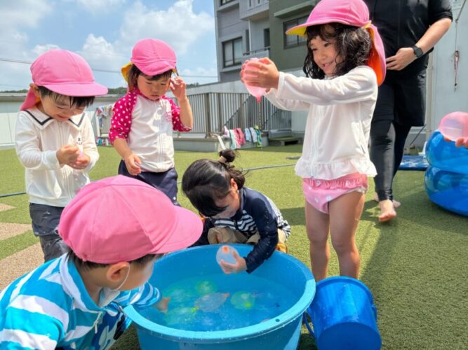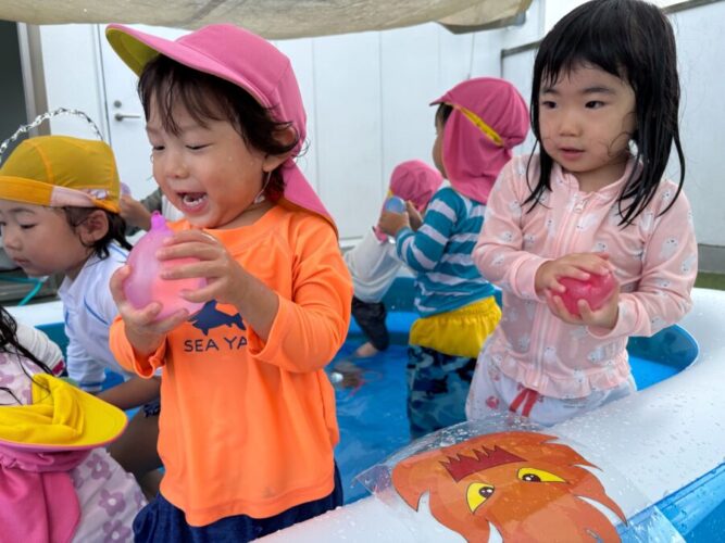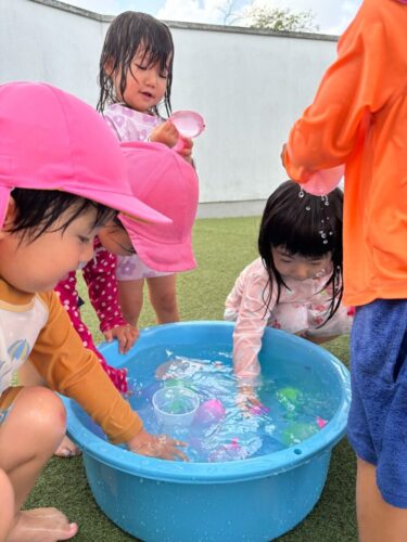 保育者がプールでウォーターバルーンを作ると水風船が膨らむ様子を、嬉しそうに見る子供達でした🥰