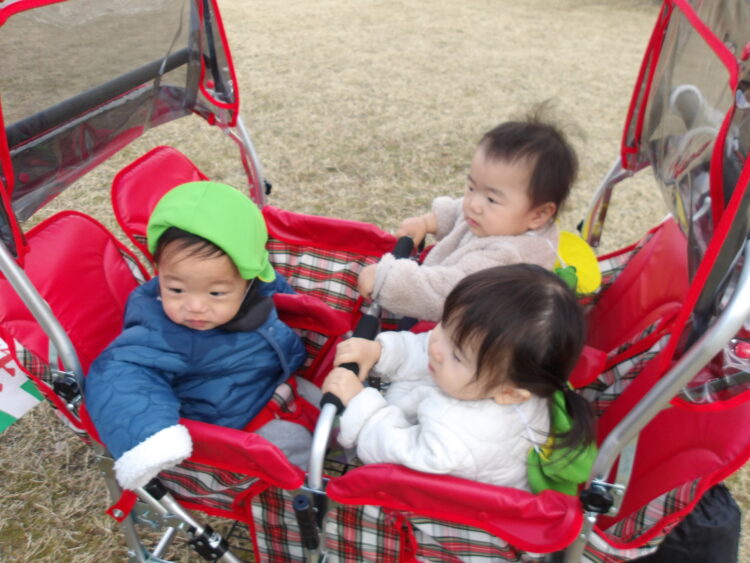 ひよこ組も今日は久しぶりのベビーカーで出かけました。あんよで公園内を散策したり、スイング遊具に乗ったりして楽しみました♡