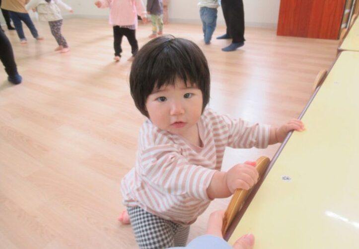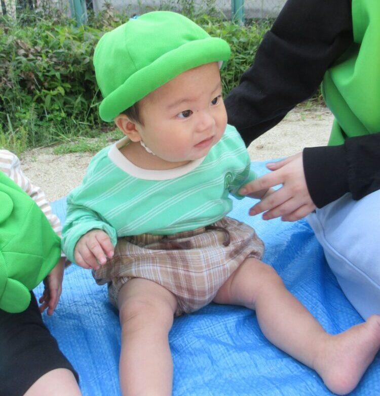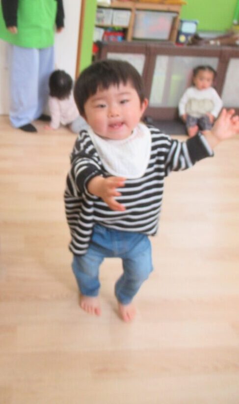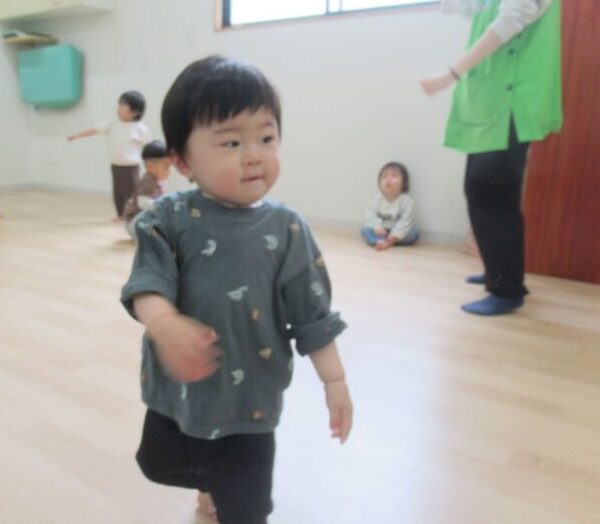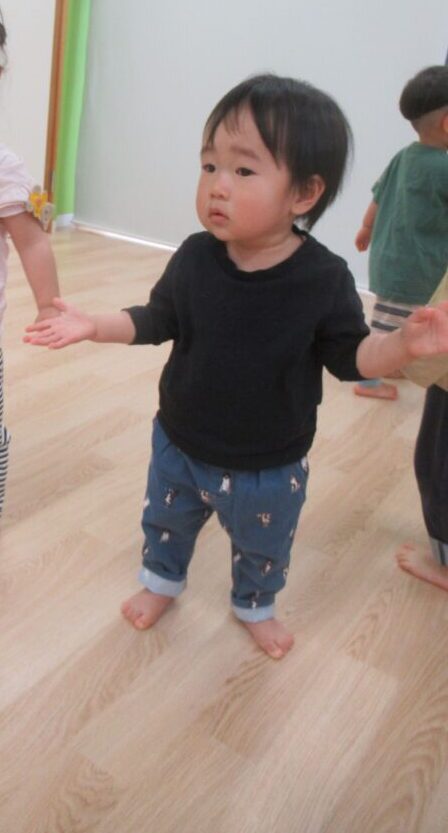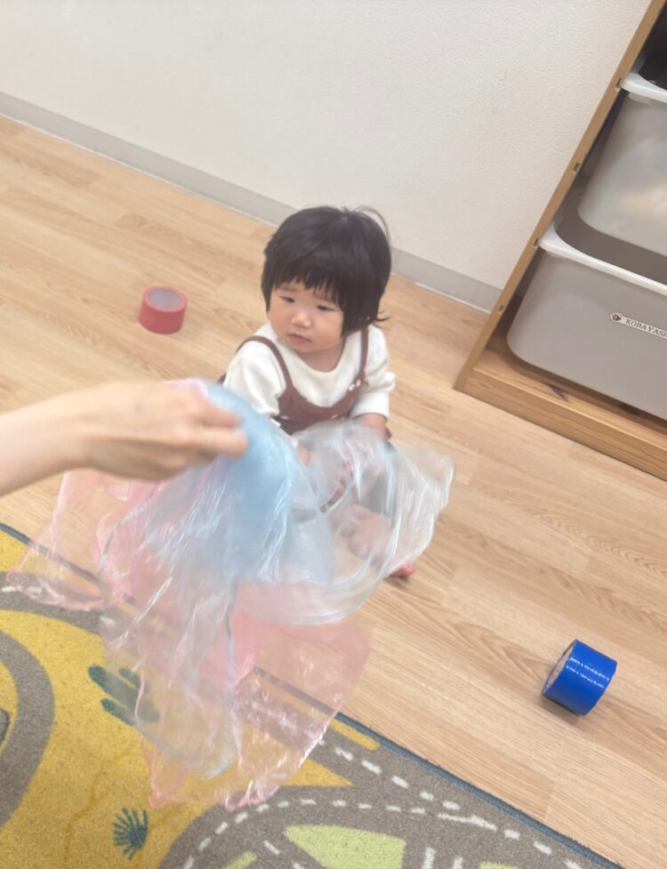 スカーフから顔が見えるとニコッと笑い、とても楽しそうでした。好きなおもちゃを自分で選んで集める姿もあり、思い思いに遊びを楽しんでいます