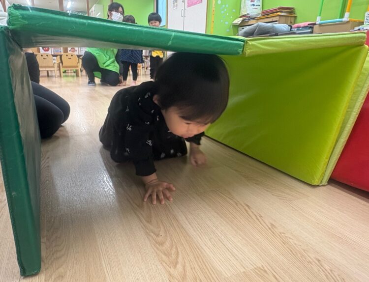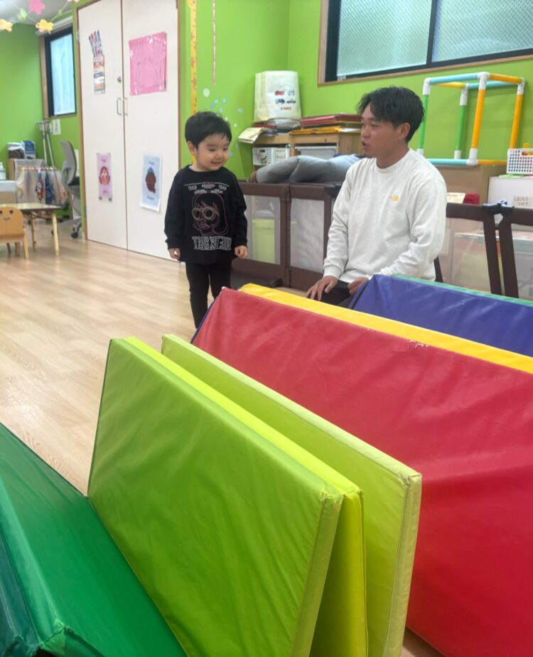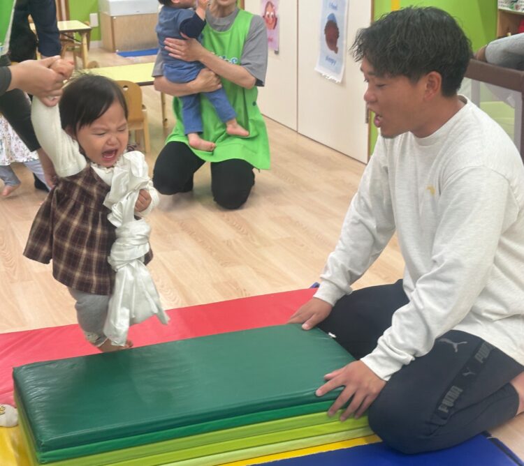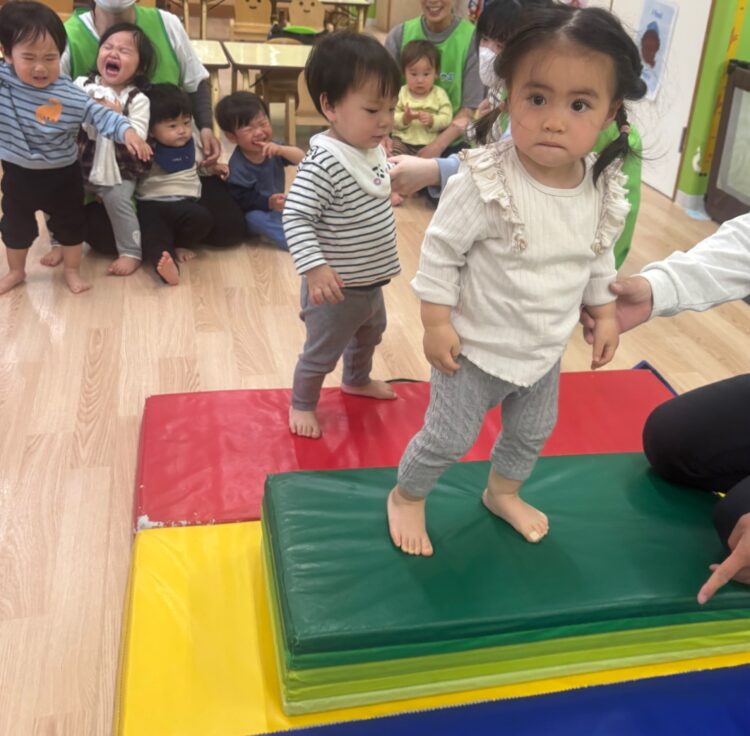 体操教室では、マットのトンネルくぐりや、マットを重ねてジャンプする遊びに取り組み、体をたくさん動かしました🤸