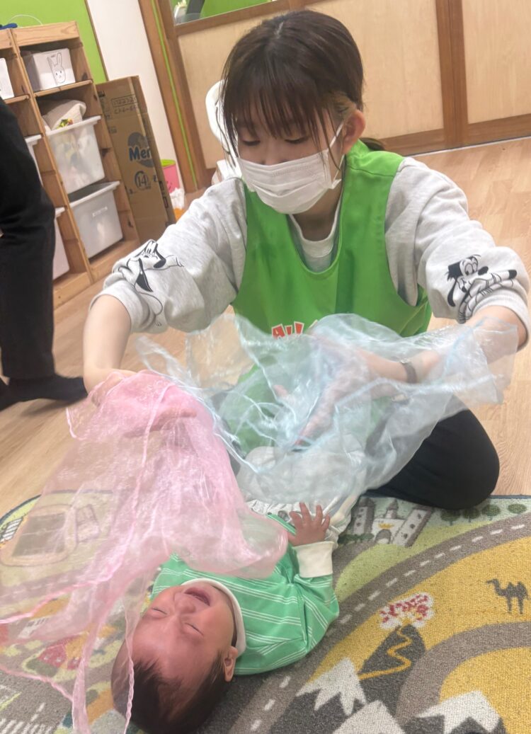 お部屋では、リトミックスカーフで「いないいないばあ」をして遊びました