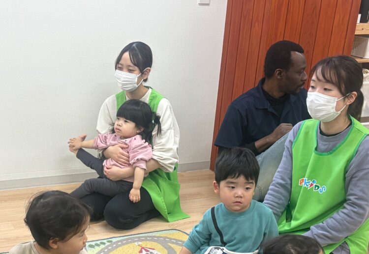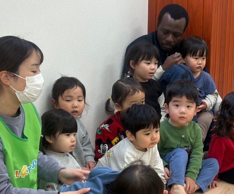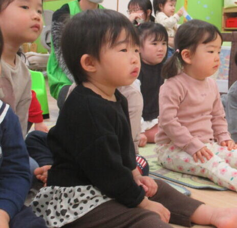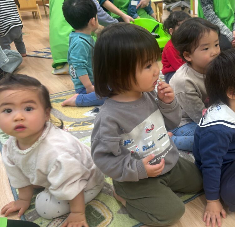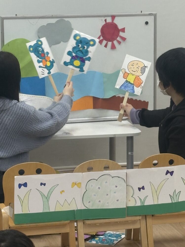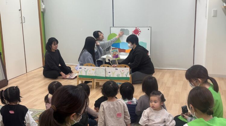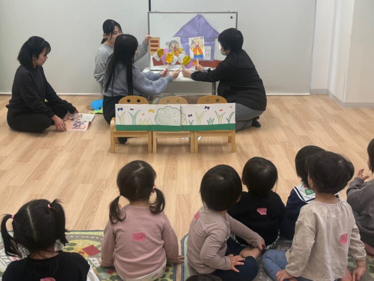 お話に合わせて歌を歌ったり、楽しいやりとりがあったりと、子どもたちは目を輝かせながら見入っていました![]()