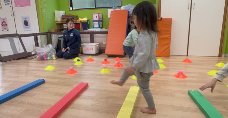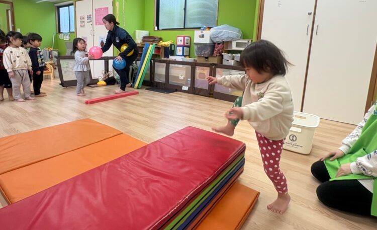 マットを使ってジャンプしたり、ボール遊びをしたりいろんなステーションを順番に回るので、子どもたちもテンションMAX