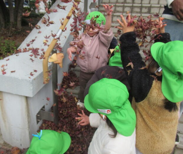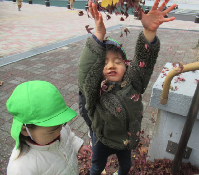 風で揺れる木の枝や、地面に落ちた葉っぱにも興味津々の子どもたちです。
