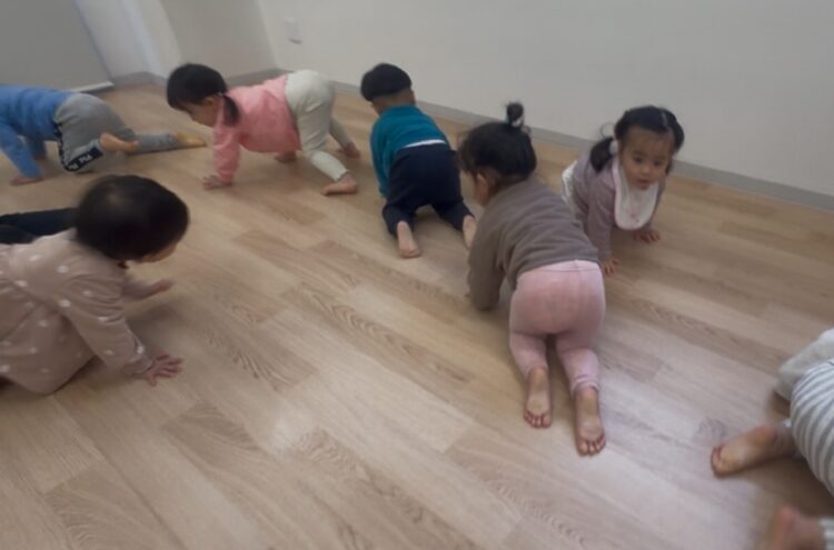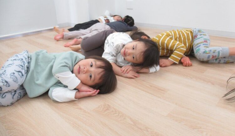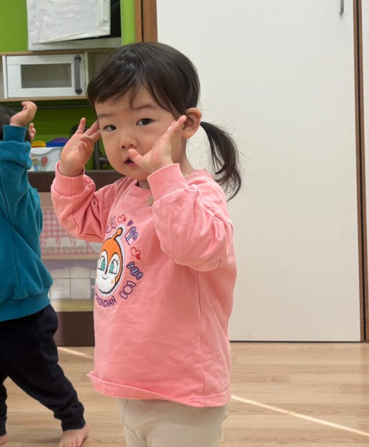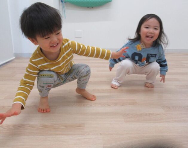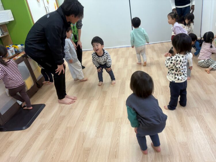 「次はなにかな?」と期待した表情を見せたり、保育士の動きを真似しながら元気いっぱいに体を動かす子どもたち。