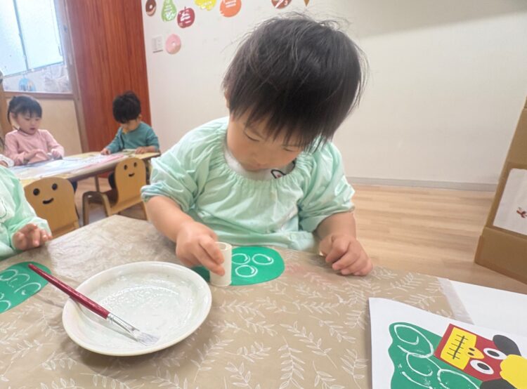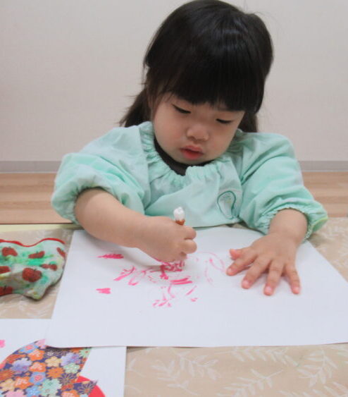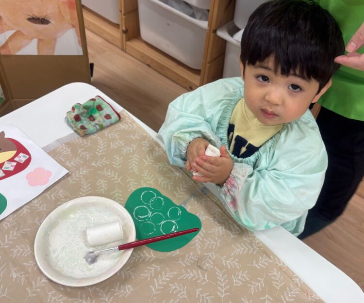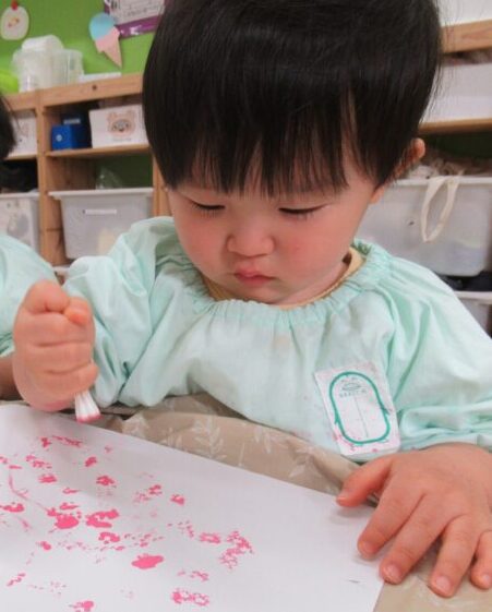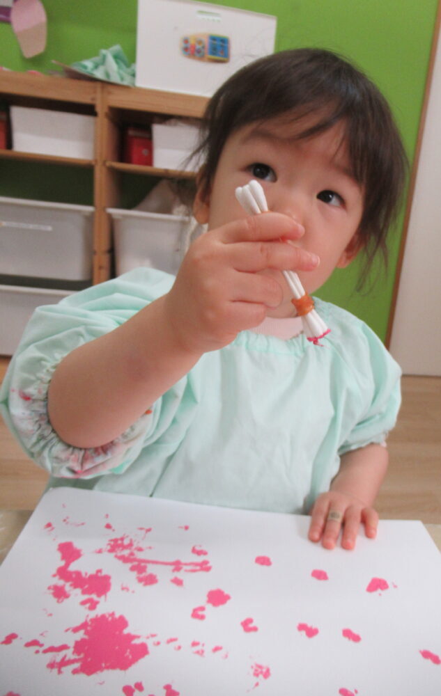 保育士と一緒に絵の具スタンプ(綿棒)でちょんちょんと触り、それぞれが「やってみたい!」気持ちを大切にして取り組む姿が見られました。