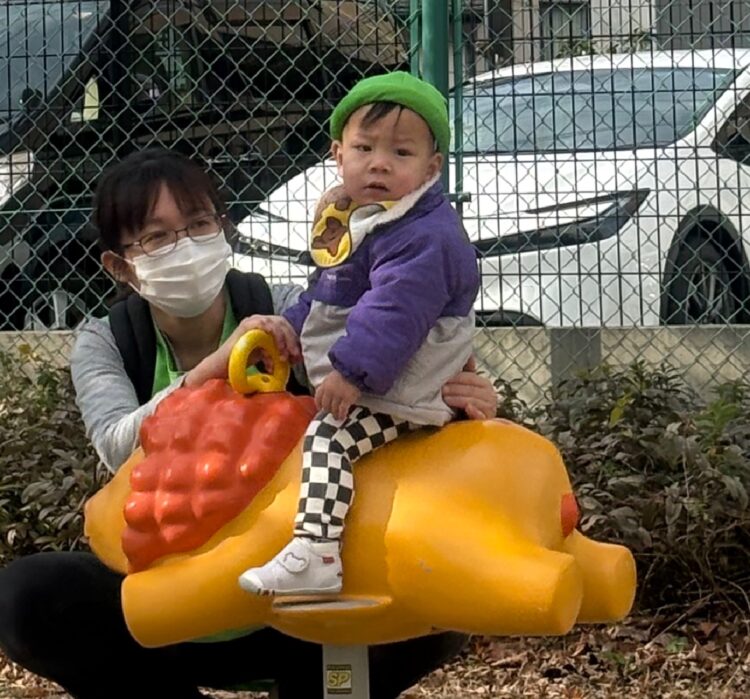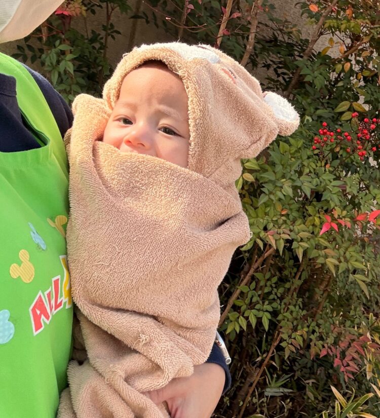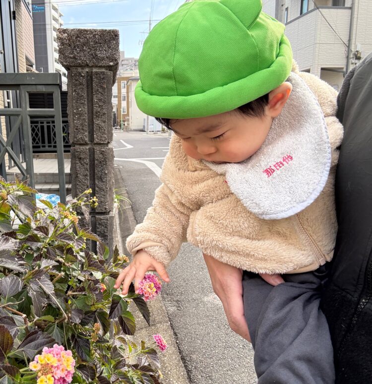 公園に着くと、ベビーカーの中から周りをキョロキョロと見渡したり、シートの上に座って落ち葉にそっと手を伸ばしたりする姿が見られました。