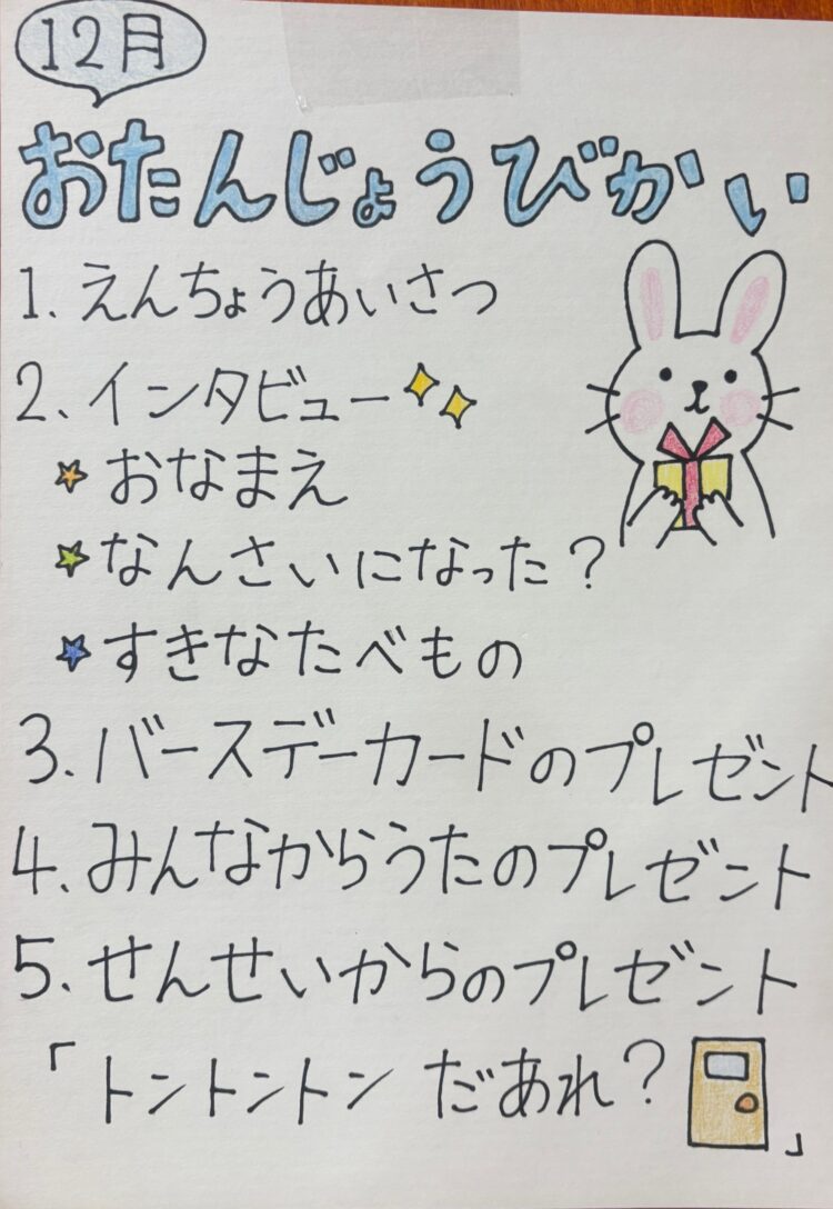 ◆寒さも厳しくなり、体調不良のお子さんが増えてきています。お休みの間はご家庭でゆったりと過ごし、体調を整えてくださいね。