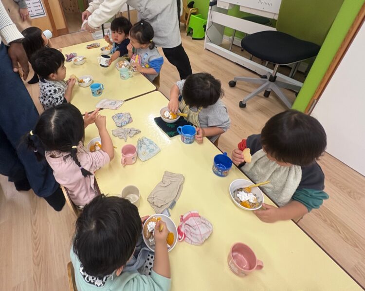 初めての感触に少し驚く子もいましたが、慣れてくると笑顔で楽しむ様子もあり、一人ひとりの成長を感じる制作時間となりました。