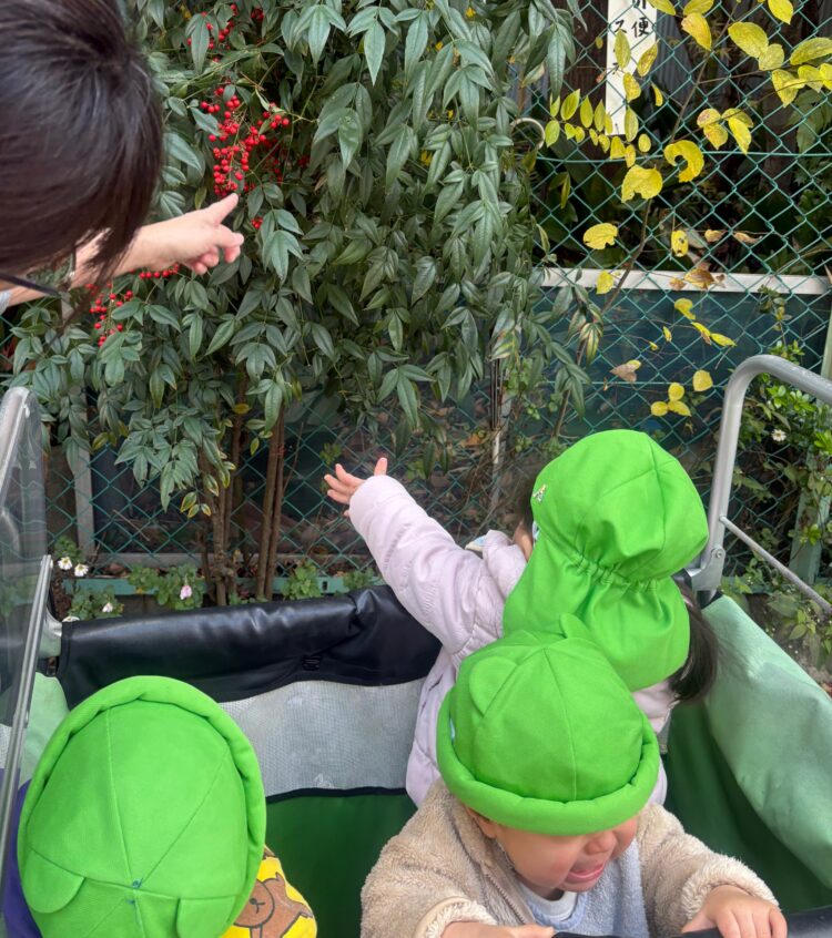 天気の良い冬の日、0歳児クラスのお友だちと公園までお散歩に出かけました![]()