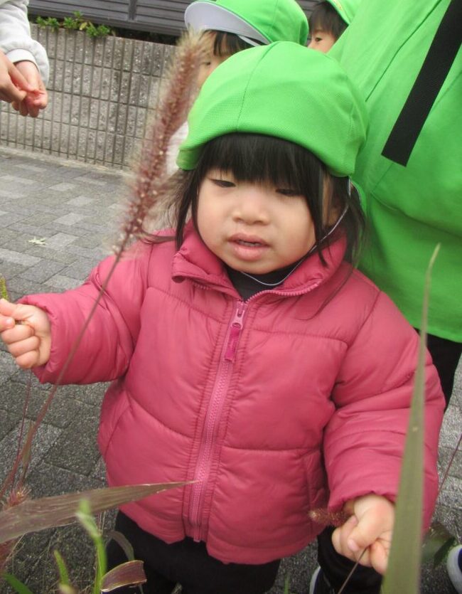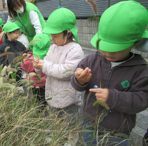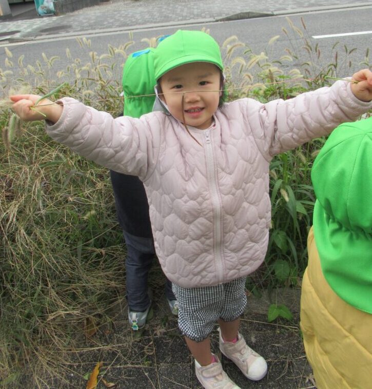 手に取ってゆらゆら揺らしたり、お友だちと見せ合ったりと、自然の中での発見を楽しむ姿が見られました。