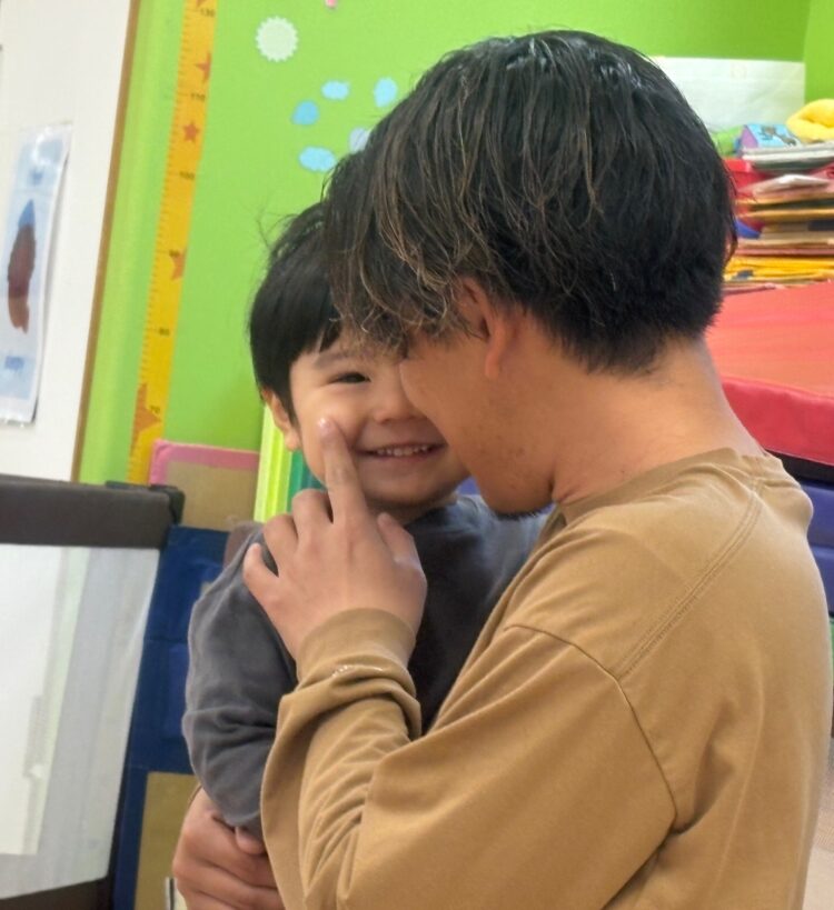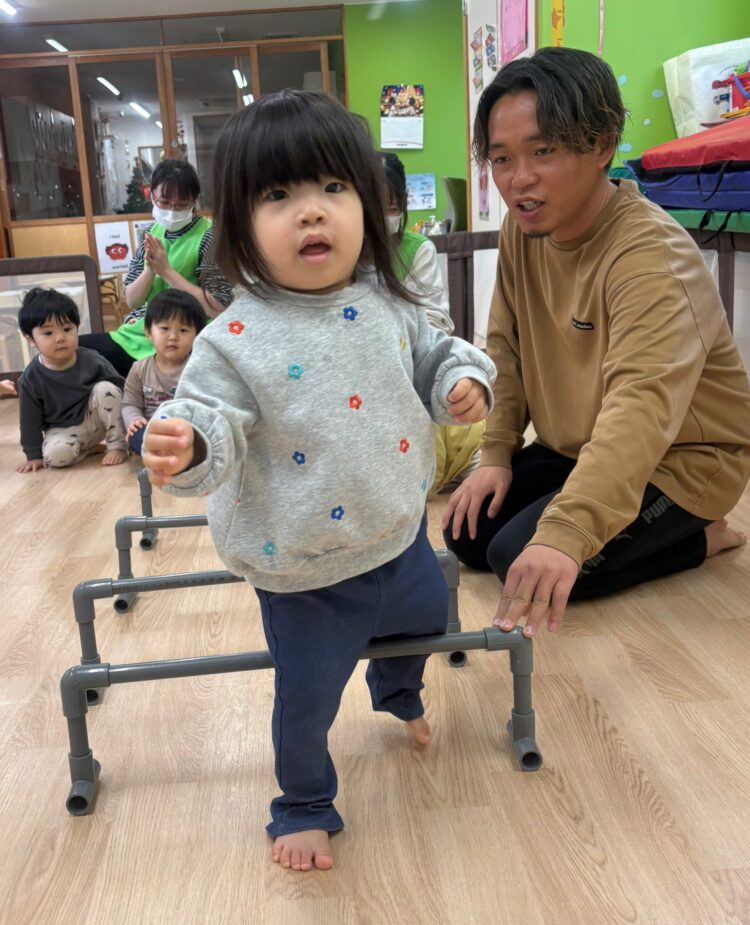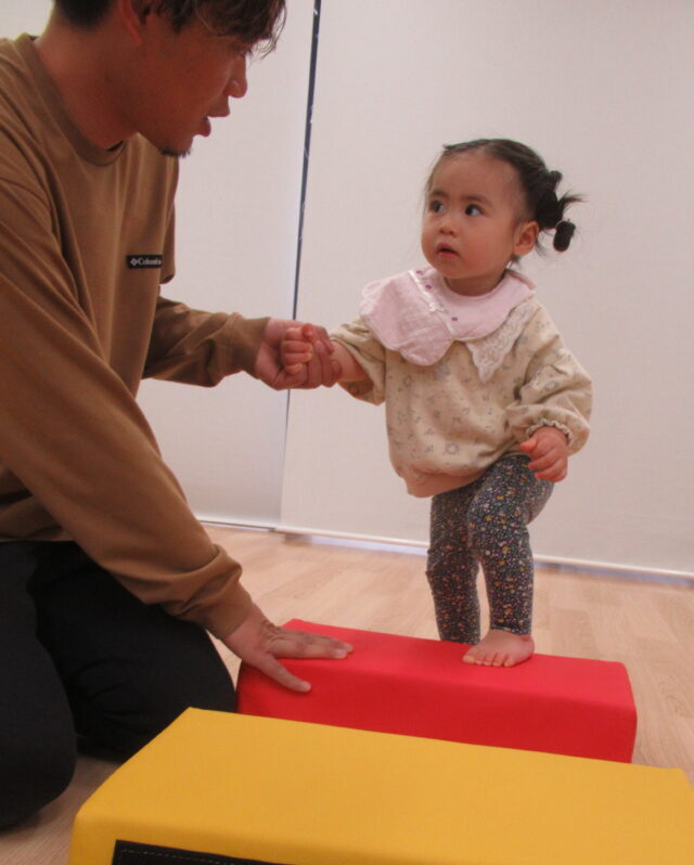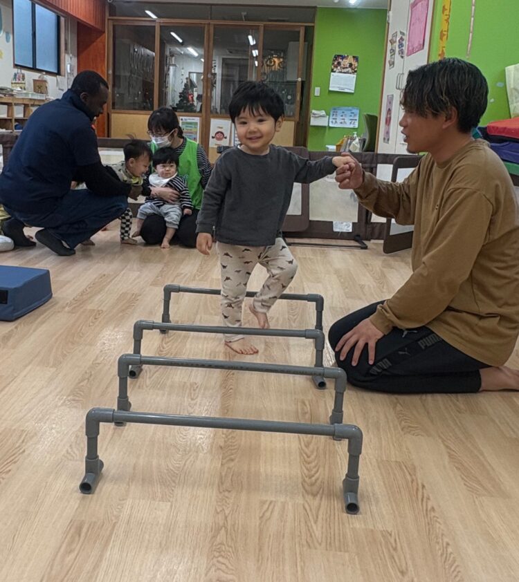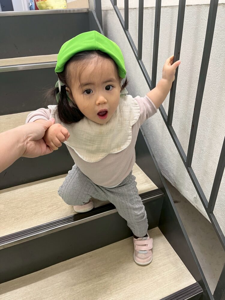 また、階段の上り下りの練習にも挑戦しました。保育者と手をつなぎながら、一段ずつ慎重に足を運び、できたときにはとても嬉しそうな表情を見せていました。