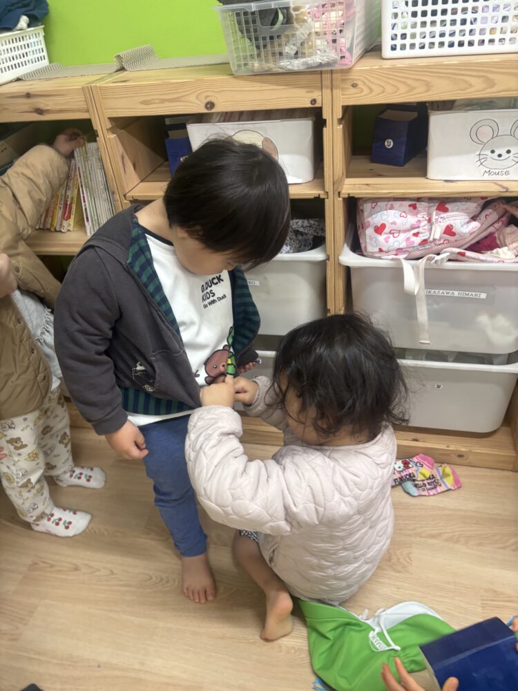 ◆着替えの時間、自分の服を脱いだあと、お友だちの服をそっと手伝おうとする姿が見られます。自分の着脱ができるようになってきたことで、「やってあげる!」とお友だちを手伝う様子が見られました。