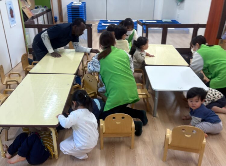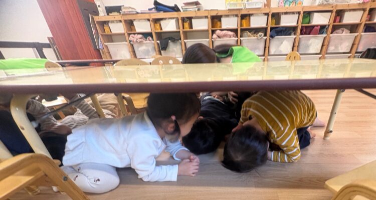 「ダンゴムシのポーズ」を一緒に練習し、頭を守ることを伝えると、みんな真似をしながら上手に体を丸める姿が見られました🚒🚑