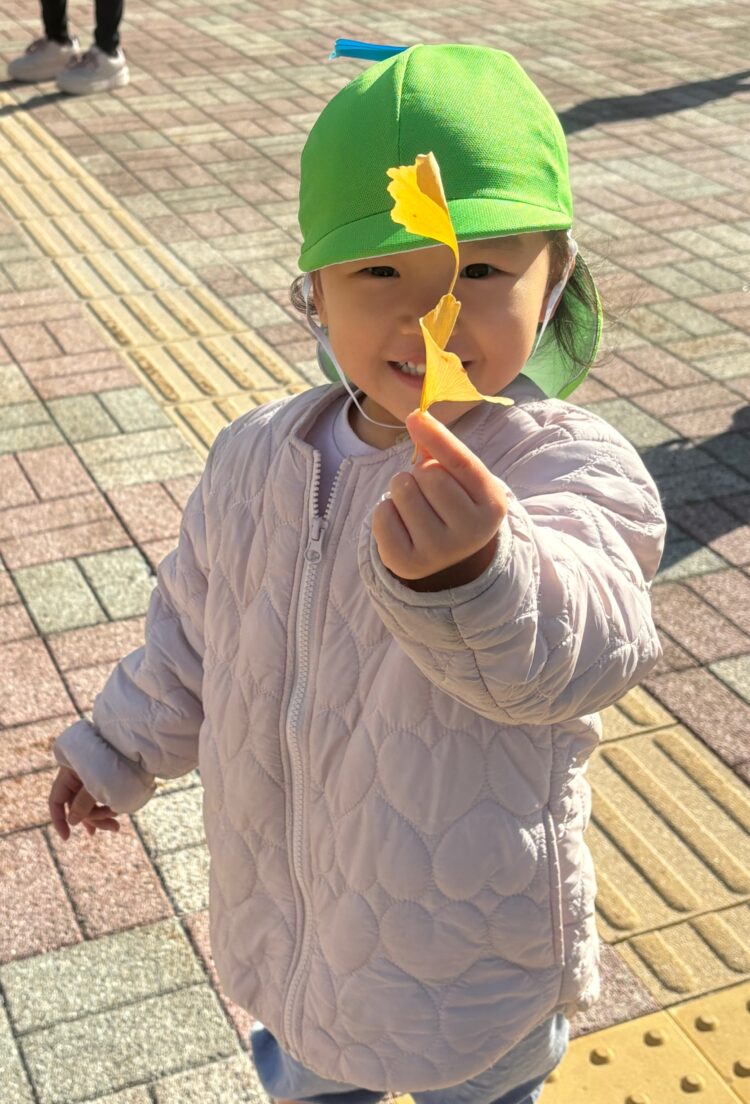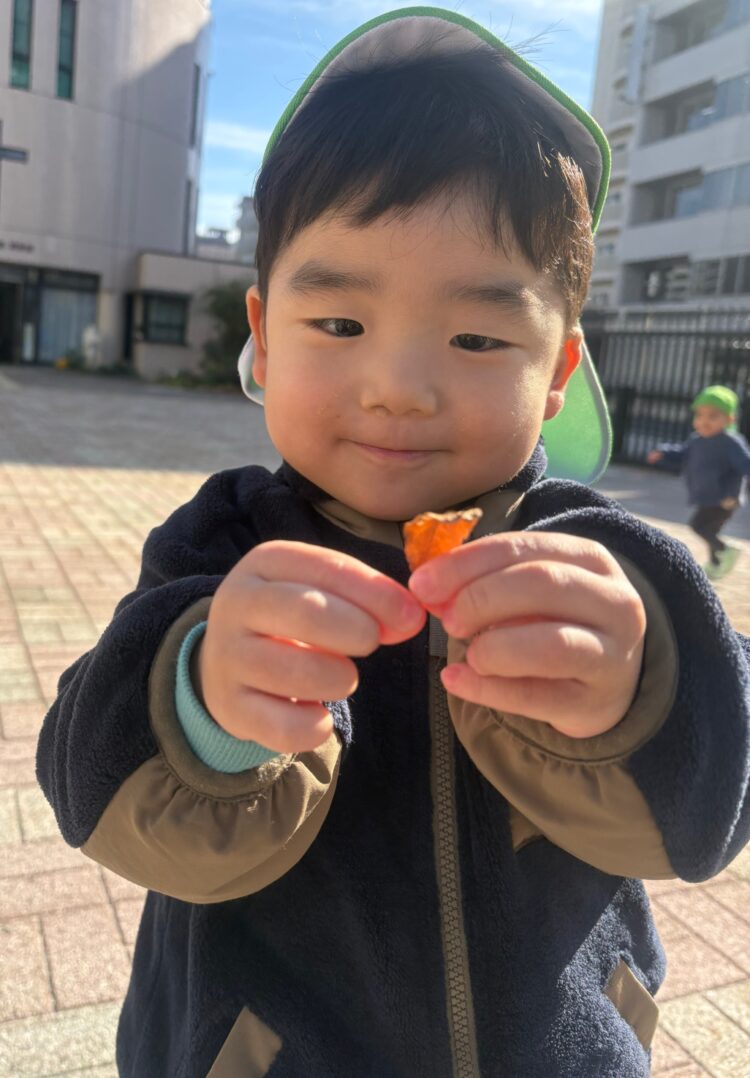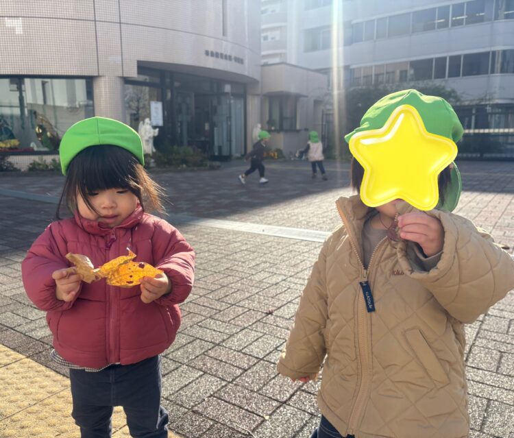冬の太陽の光に照らされてキラキラと輝く落ち葉を、子どもたちは嬉しそうに拾ったり踏んだりしていました。