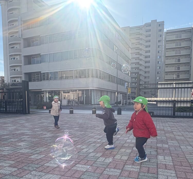 冬の空気にシャボン玉がキラキラと浮かぶ光景は、本当に絵本の一場面のよう。写真を撮ると、光が反射してまるで魔法の世界のようでした