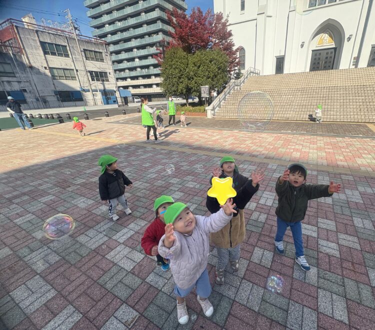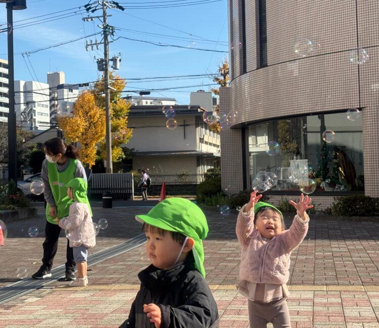 教会の広場に着いたら、待ってましたのシャボン玉遊び🫧