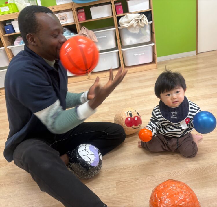 カラフルなボールをつかんだり転がしたり、やりとりを楽しむ子どもたち。
