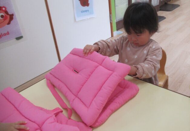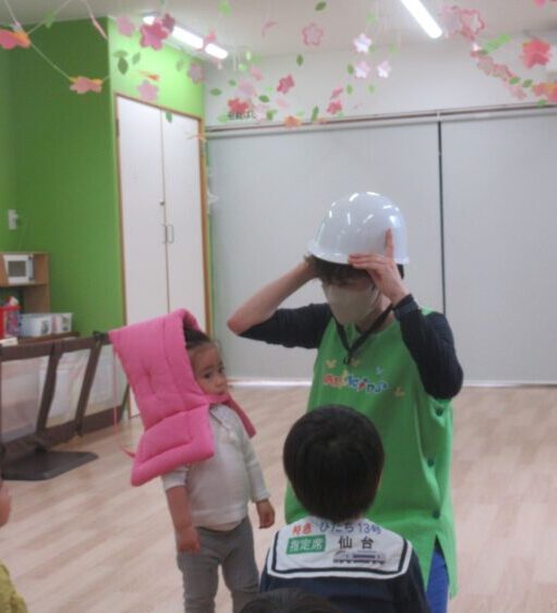 子どもたちには、防災頭巾をかぶる理由を分かりやすく伝えました。「大切な頭を守るためだよ」と話すと、真剣な表情で聞いてくれていました![]()