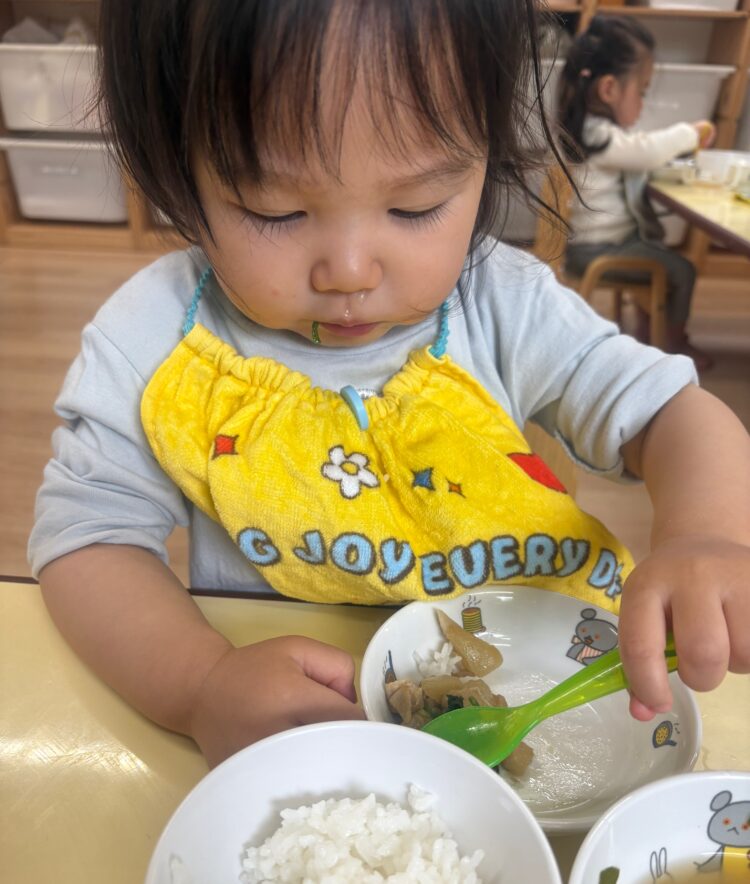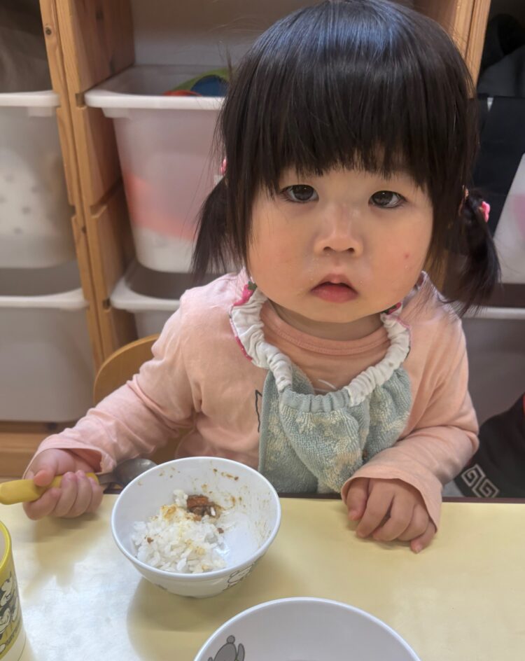 いっぱい遊んだあとは、お待ちかねの給食の時間。お腹もぺこぺこで、みんなモリモリとよく食べてくれました🍚