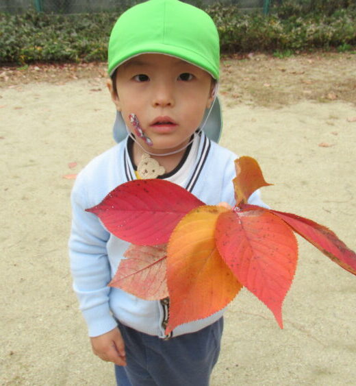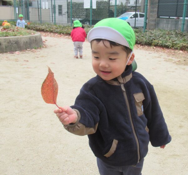🍁 落ち葉を見つけて自然あそびも楽しみ地面に落ちた葉っぱを拾って「カサカサって音するね」と耳を澄ませています。
