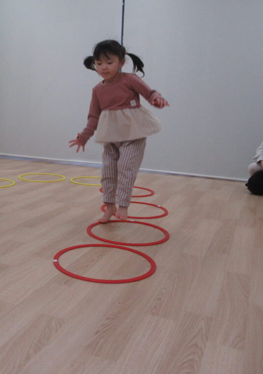 次は、床に並べたフープの中を ポン、ポン と歩いて進む練習。