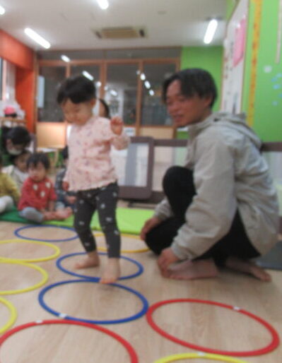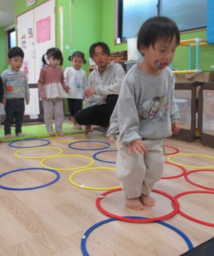 両足をそろえて「ぴょん!」と跳ぶのはまだ難しい子もいますが、