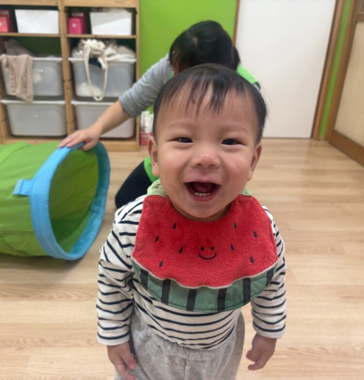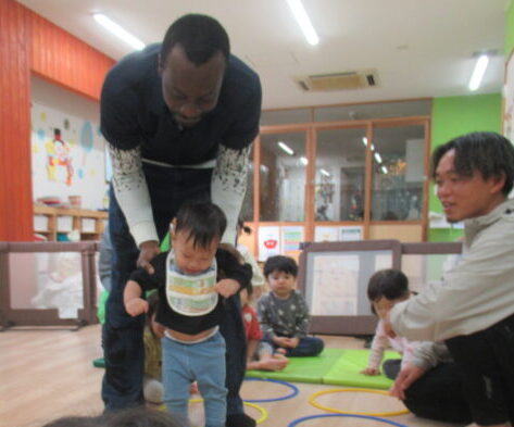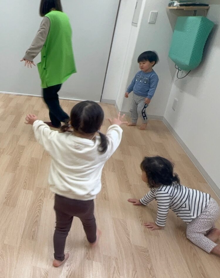 保育者が反対側から「おいで〜」と呼びかけると、嬉しそうにニコニコしながら進む姿がとてもかわいらしかったです。