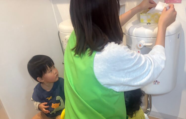 1歳クラスの高月齢のお友だちが、トイレに興味を持ち始めています✨