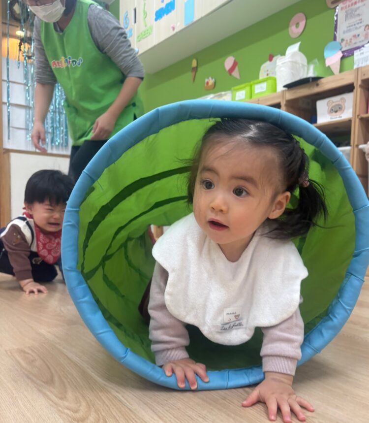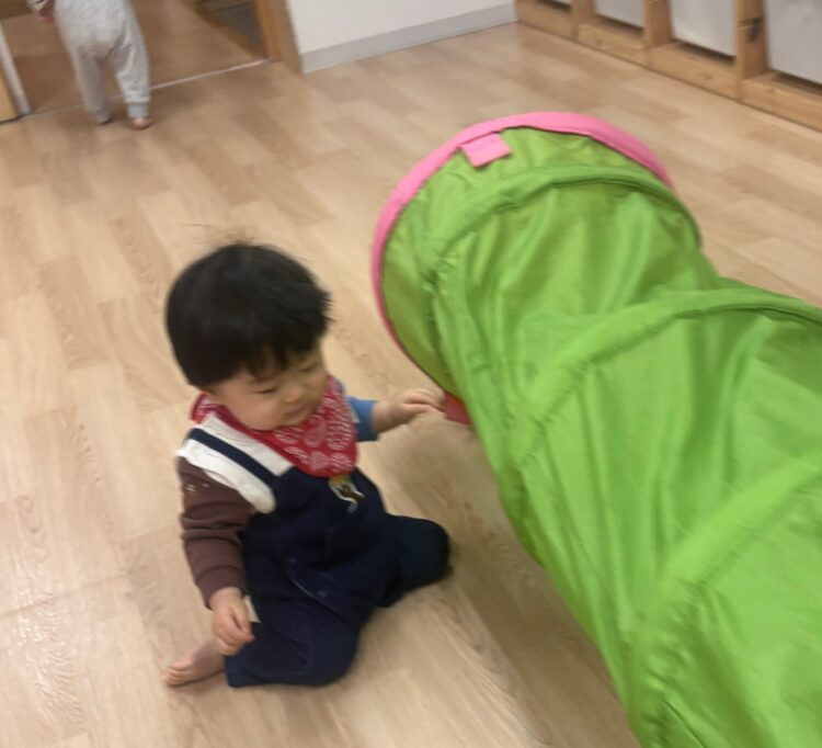トンネルの中をくぐることで体の使い方(ハイハイ・ずりばい)を育てるだけでなく、“くぐる・出る”といった空間の感覚を楽しむ経験にもつながります。