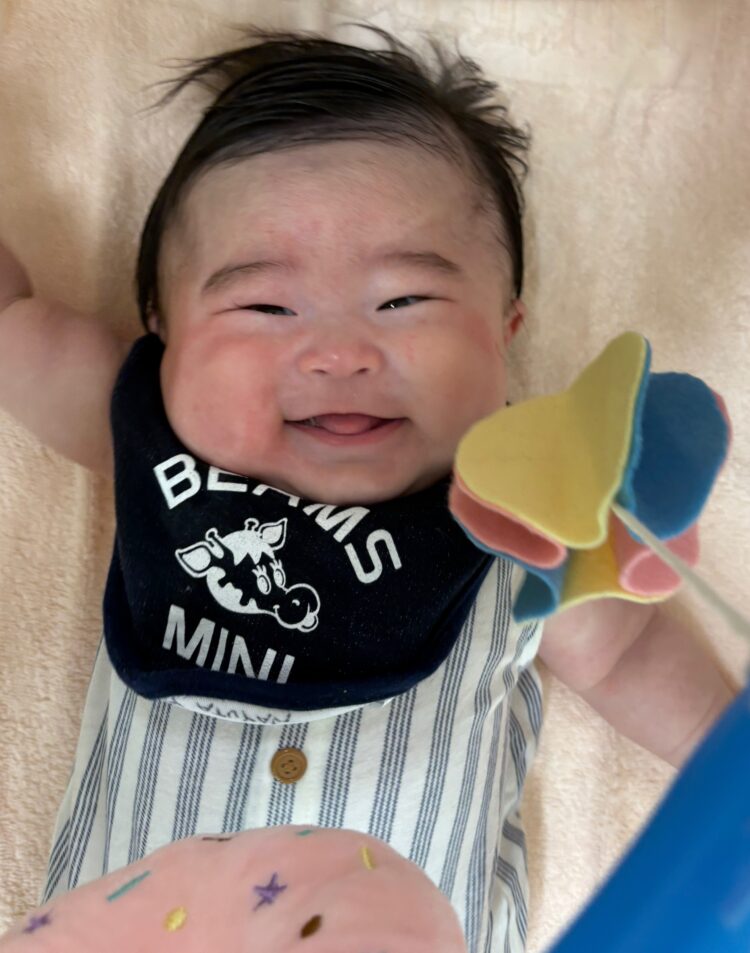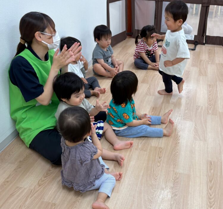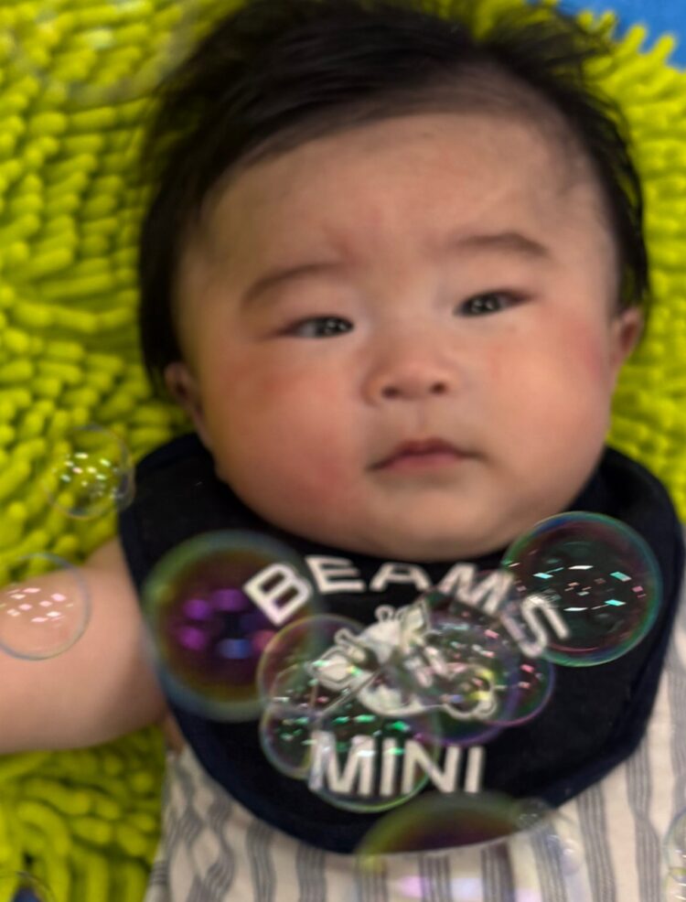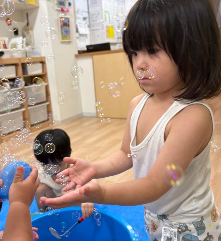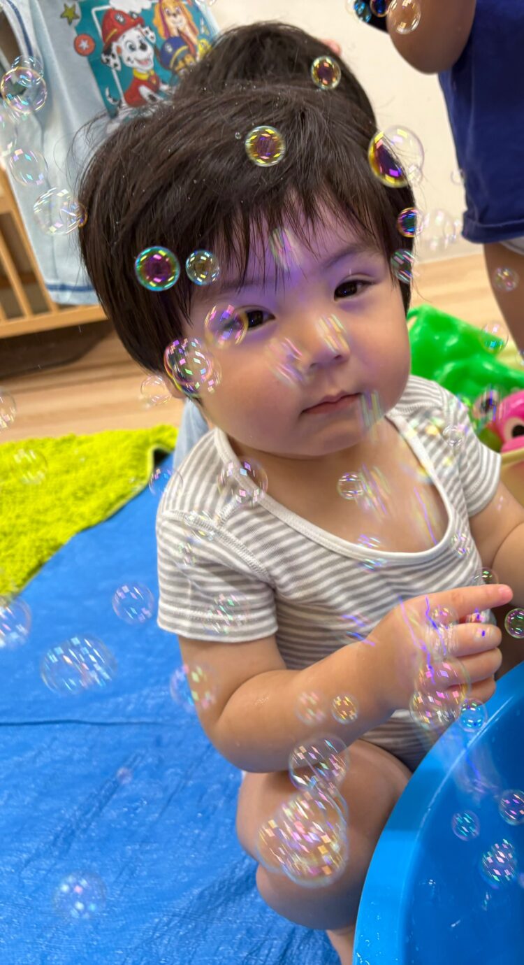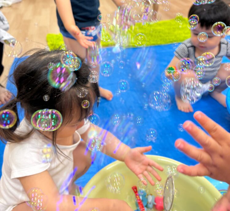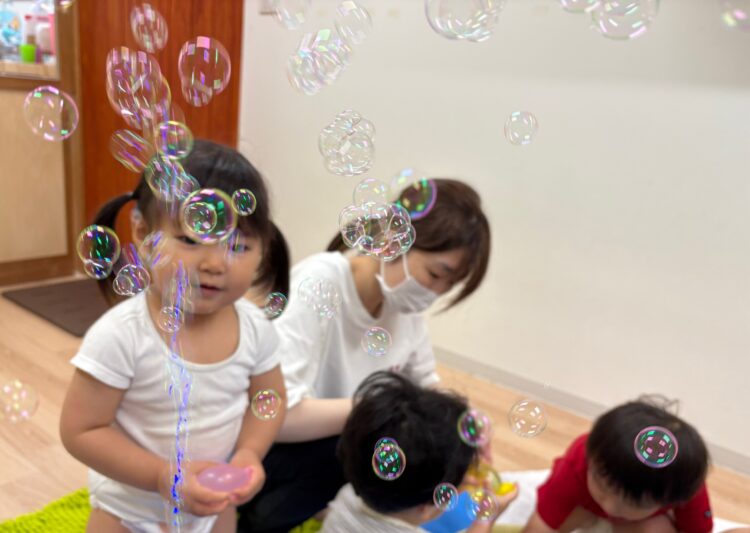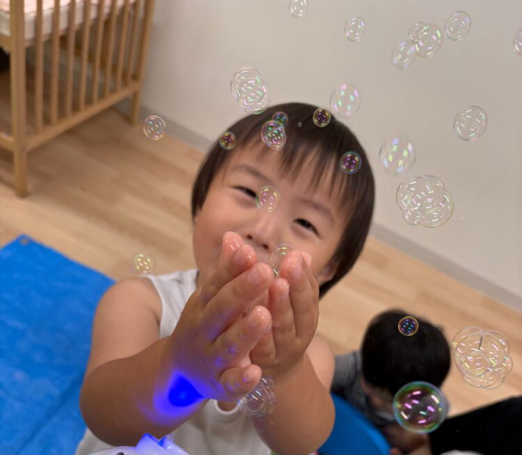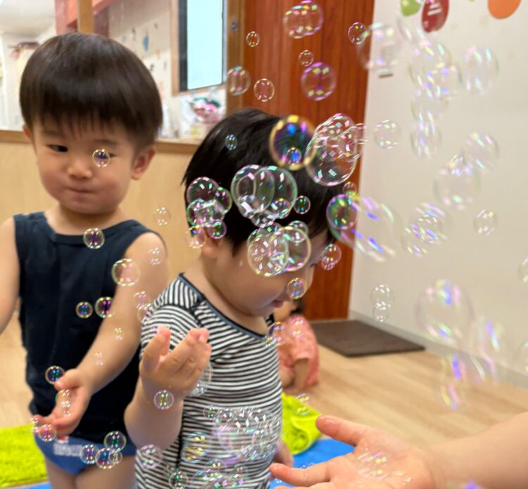 シャボン玉の動きをみたり、手を伸ばそうとしたりする姿が見られました