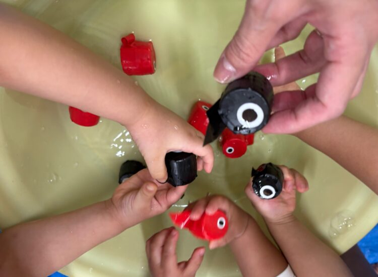 先生の手作り魚が桶の中泳いでるよー
