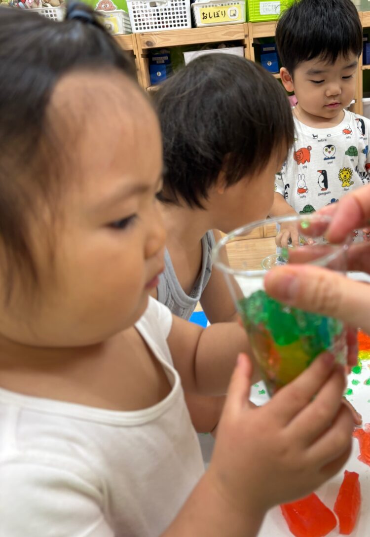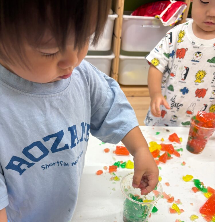 寒天遊びを通して、感触を楽しんだり、手指の感覚を養ったり、想像力や表現力を育んでいきます。