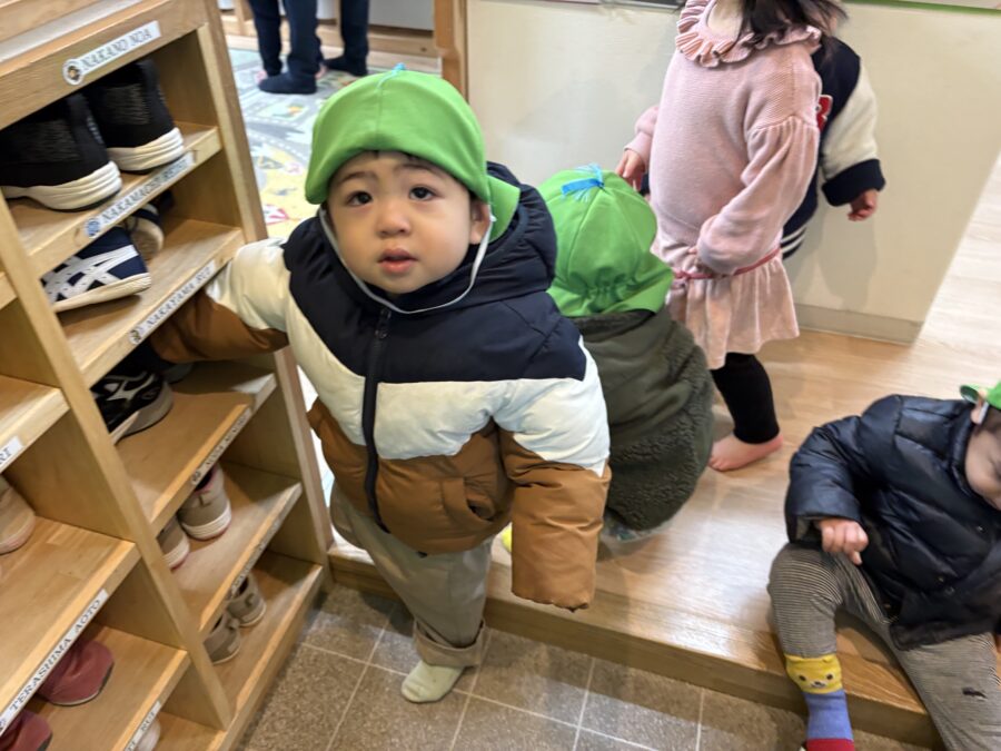 戸外に行く準備、玄関で靴を履きます。