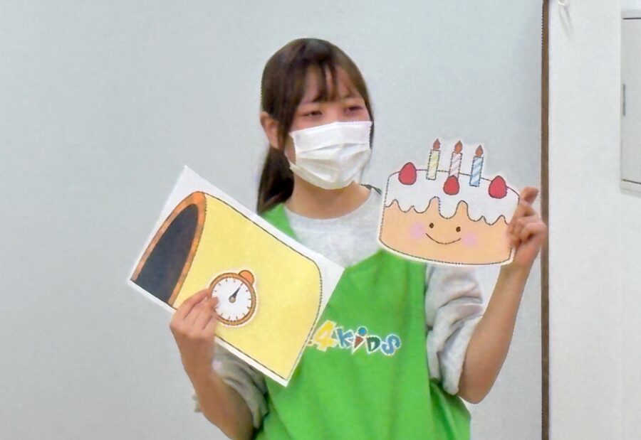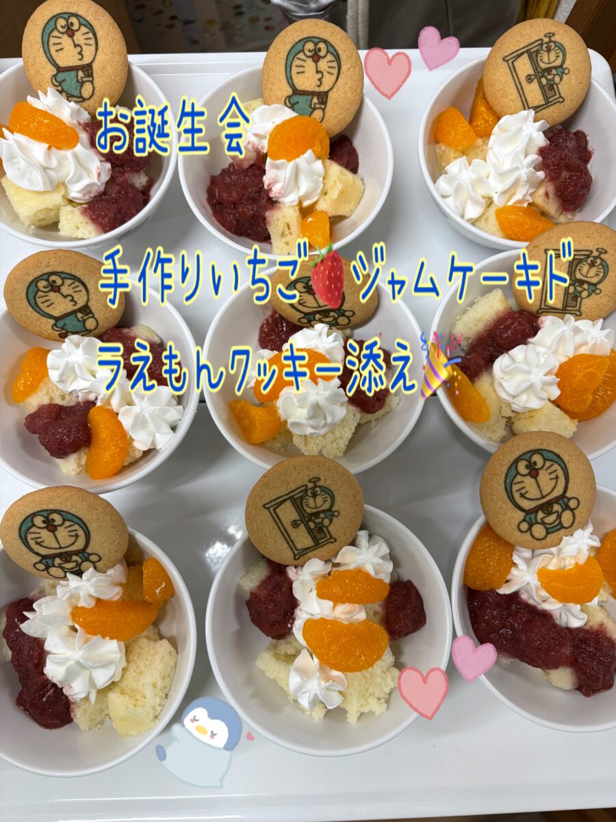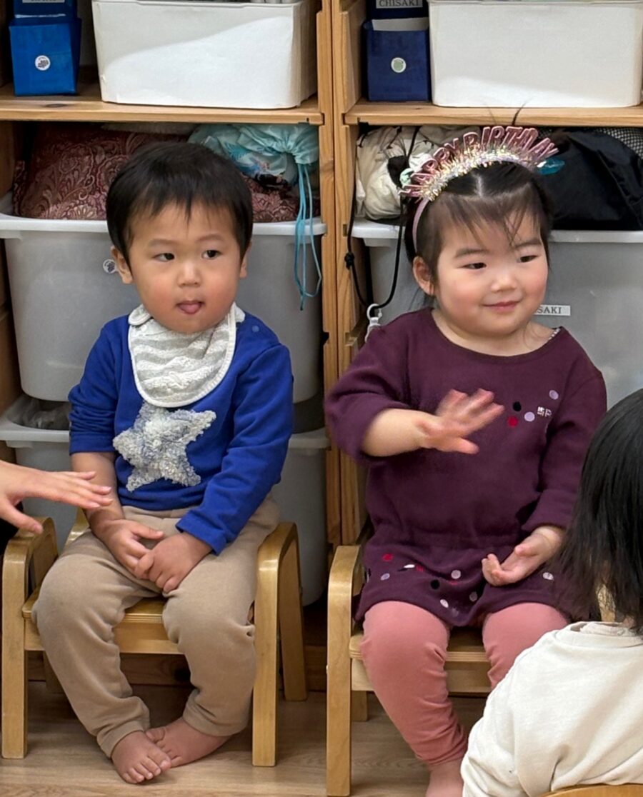 保護者の方や、お友だち、先生たちにお祝いしてもらい、とてもうれしそうにする4名のお友だち🎊